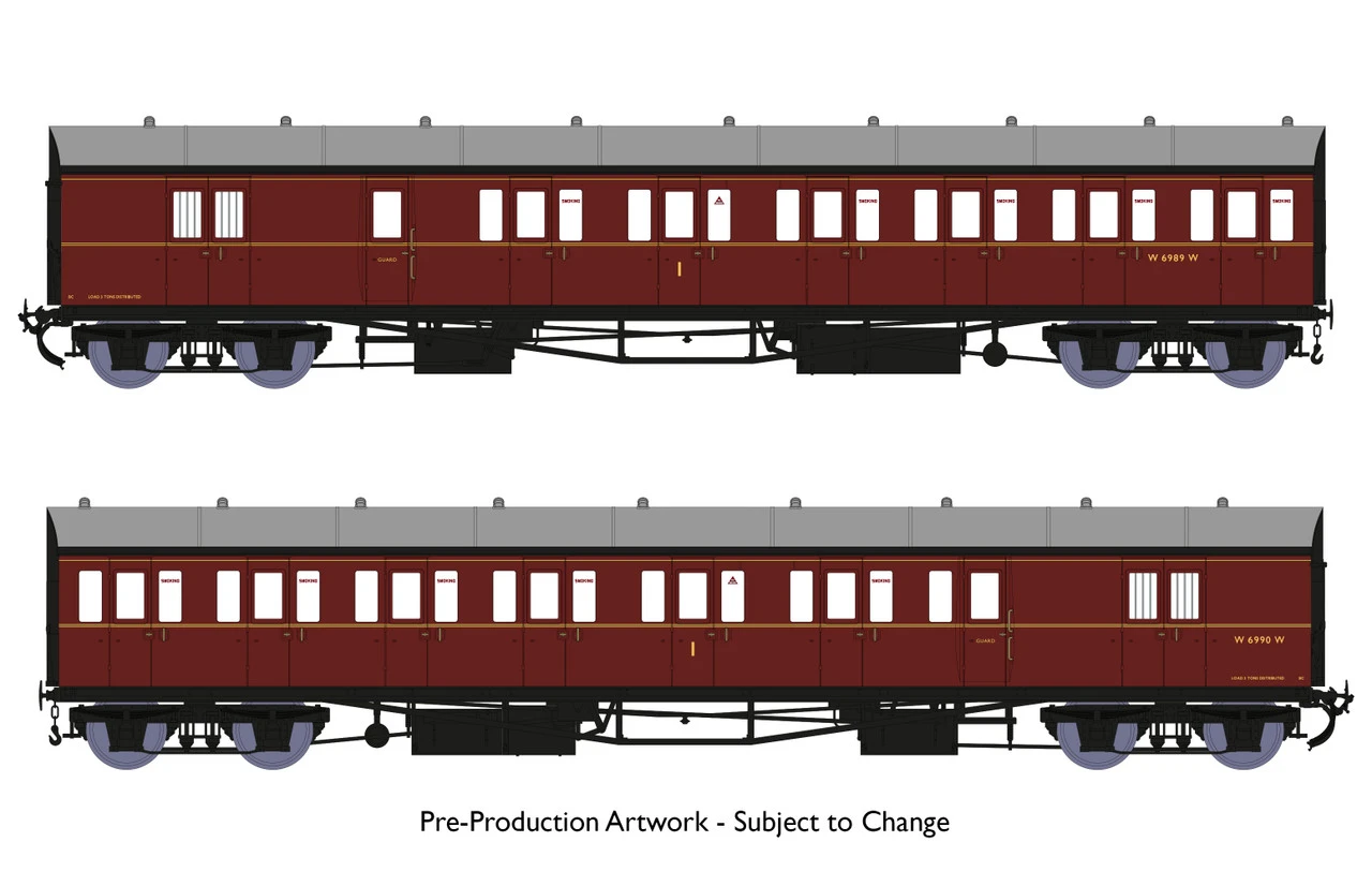 These coaches were longer and wider than previous designs and necessitated recessed door handles and Guards doors. They ran on 7ft wheelbase bogies. A total of 41 Dia. E140 sets of coaches were built.